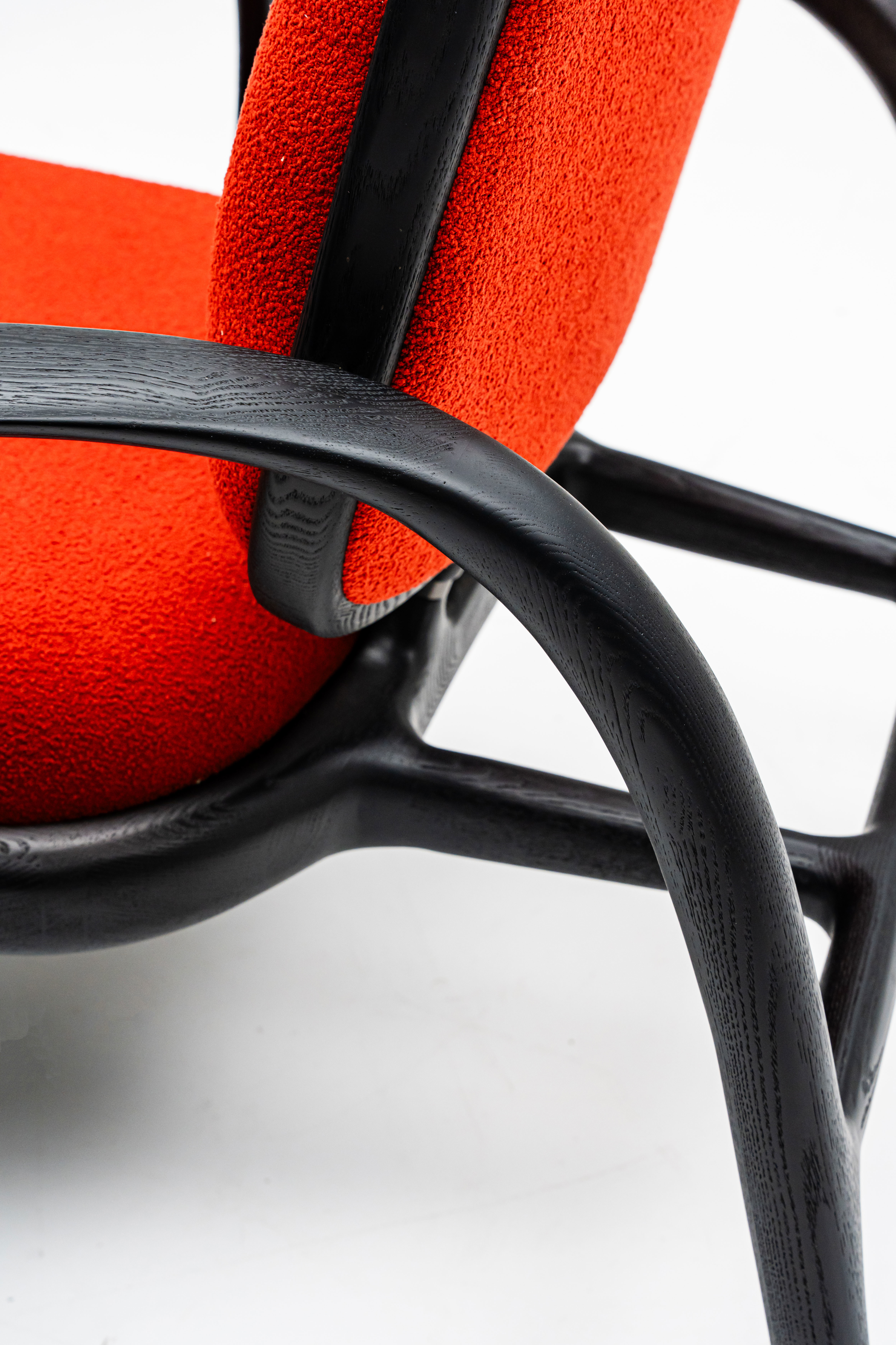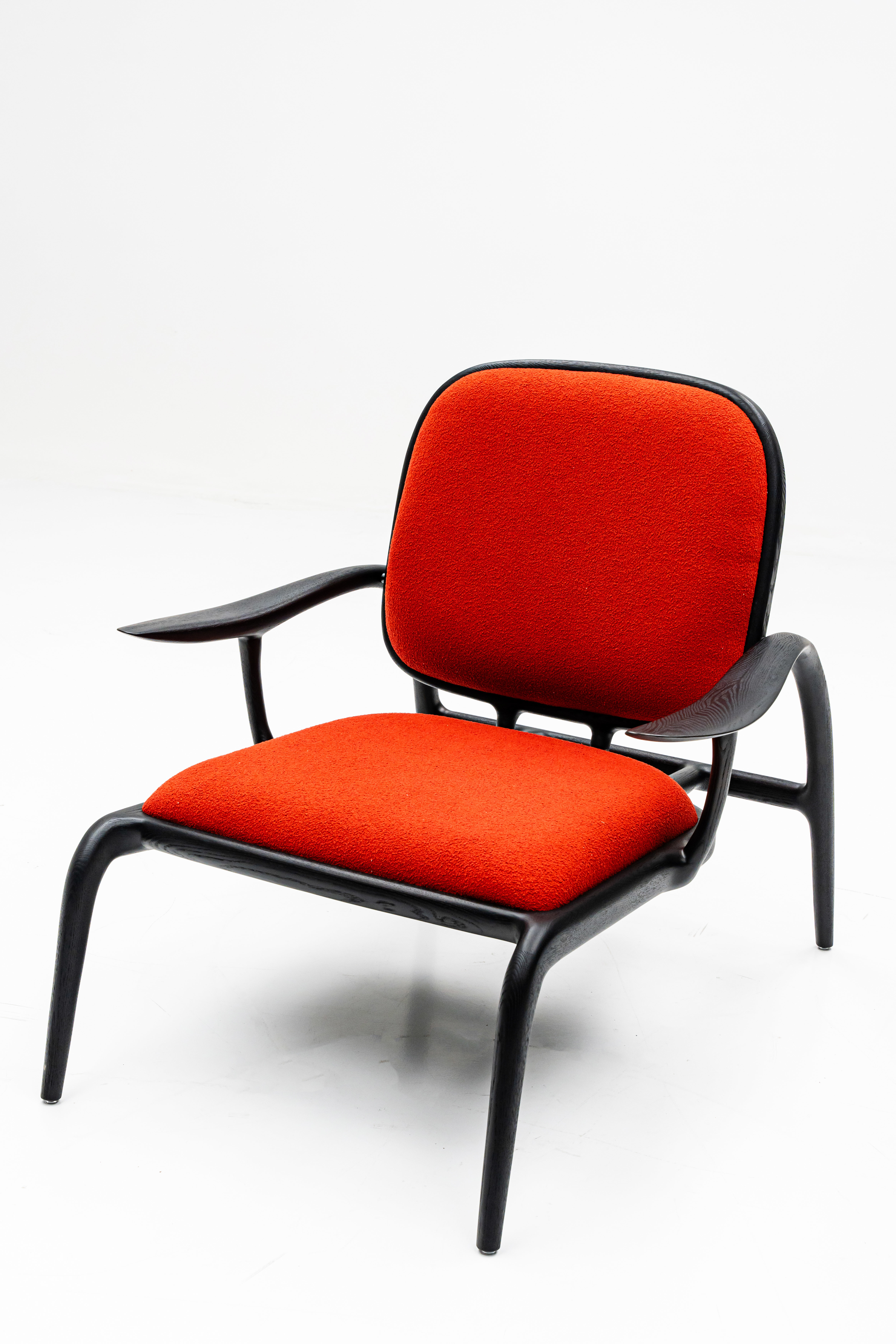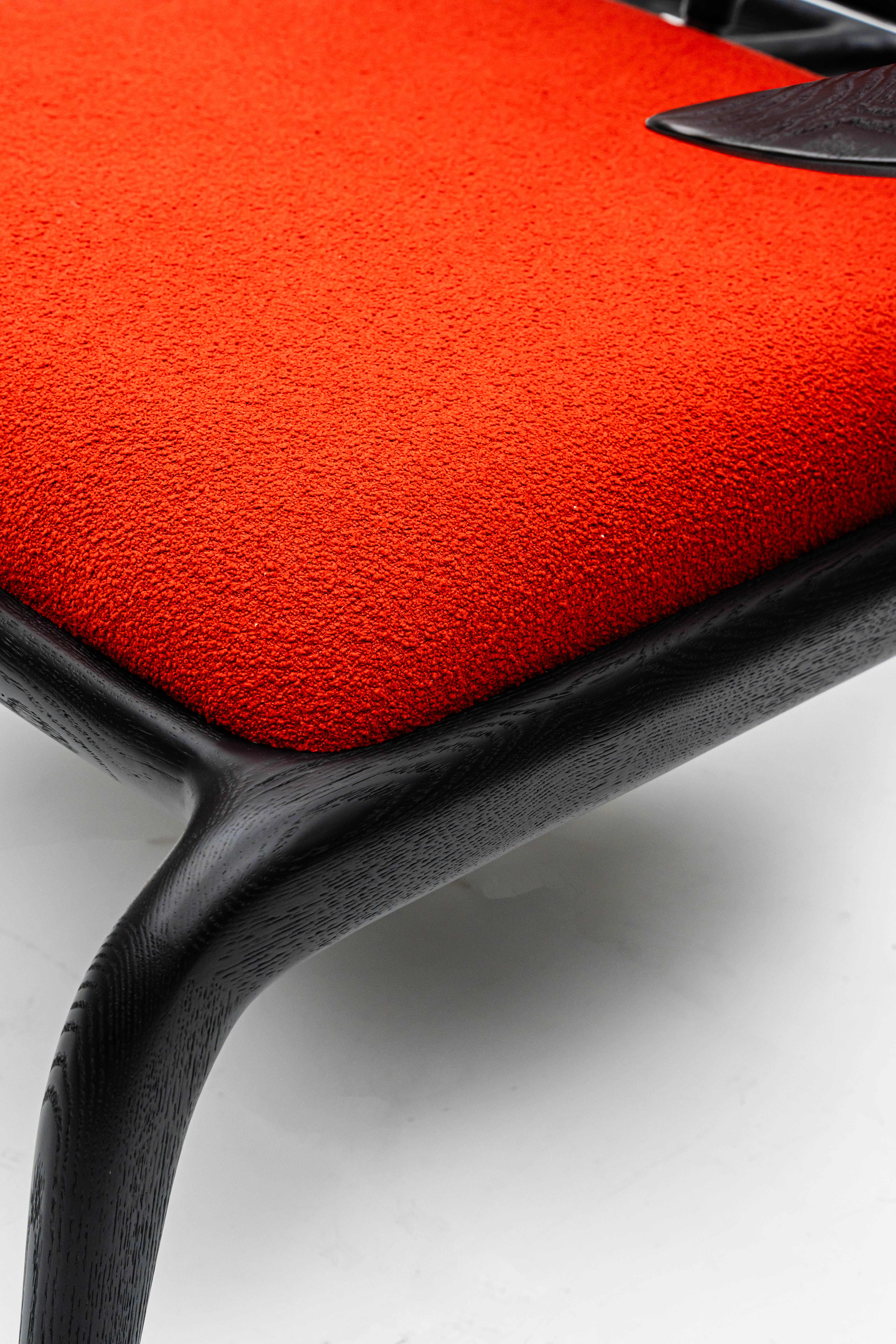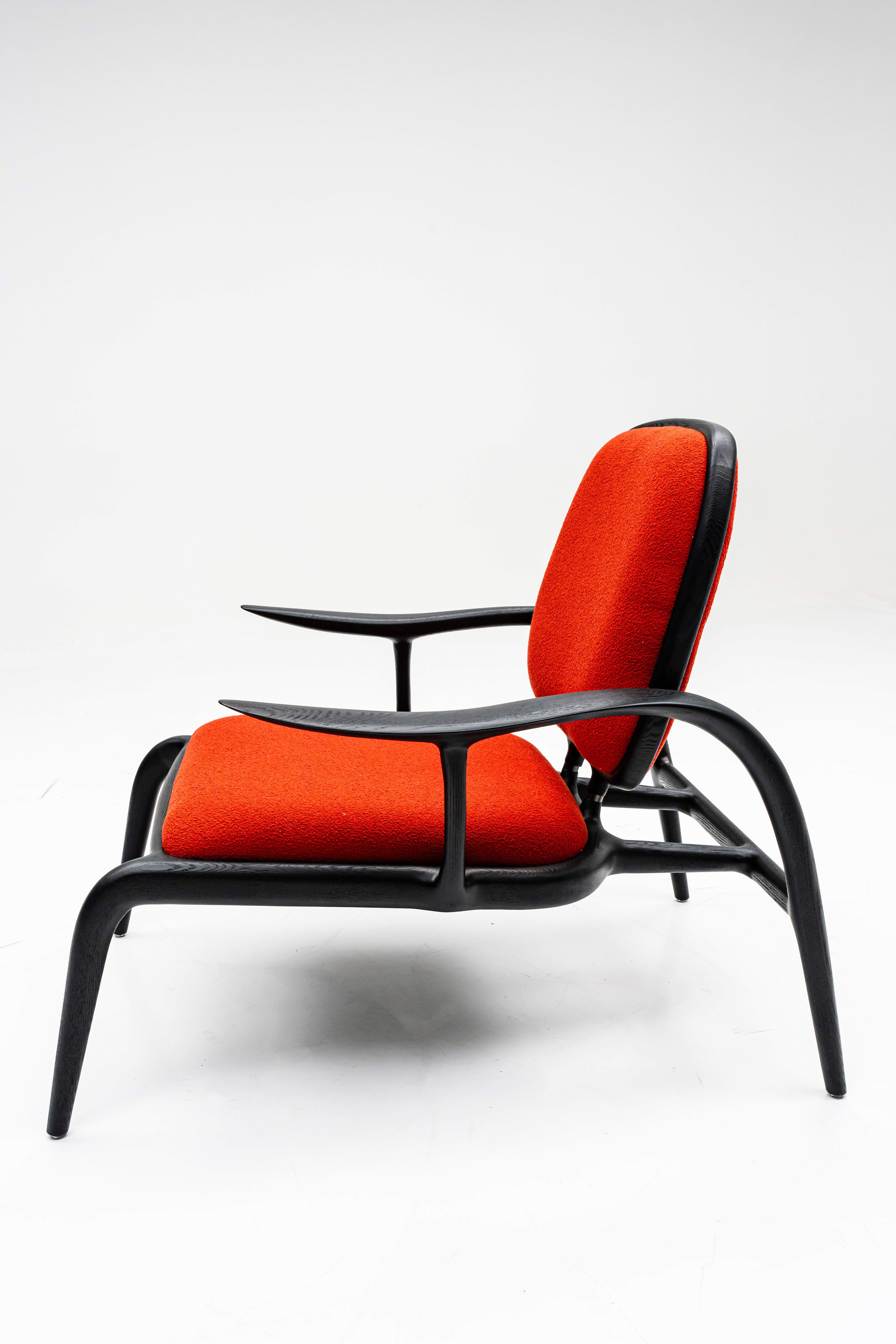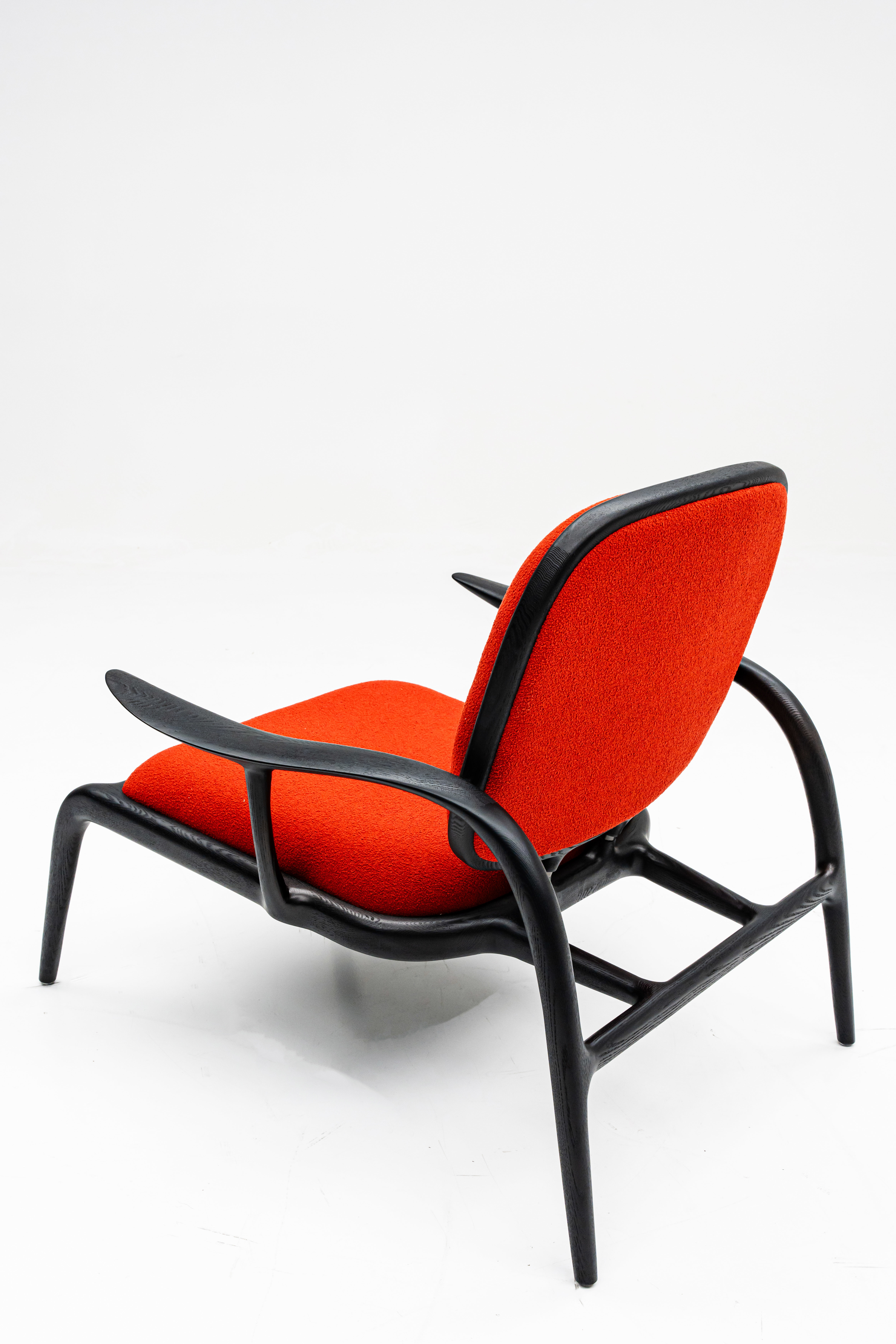 This custom luxury lounge chair is a bold statement of modern design, featuring a fluidly sculpted black-stained wood frame with organic, tapered legs and plush red upholstery that creates a striking visual contrast. The low-profile, open structure ensures both stability and visual lightness, while ...